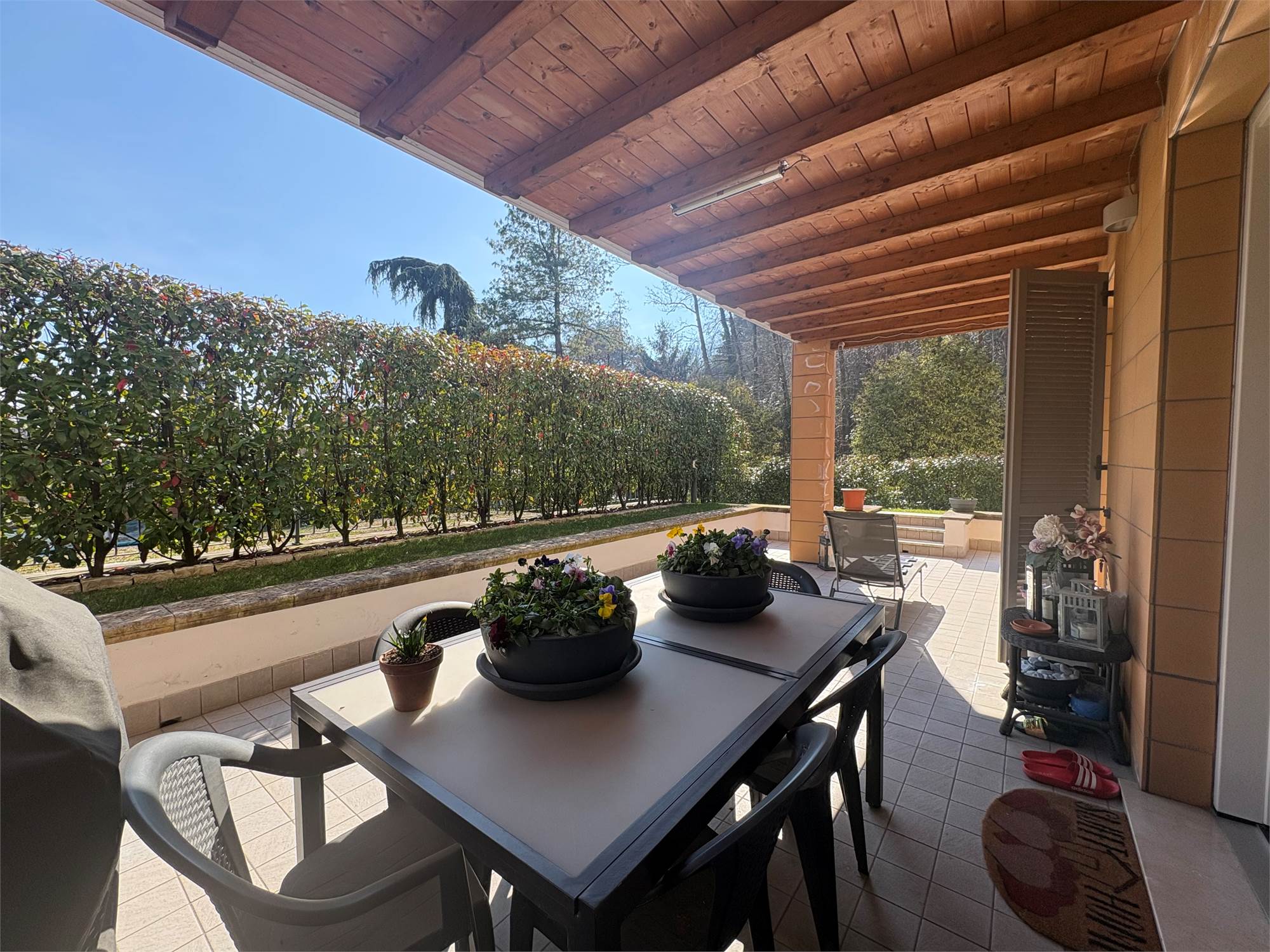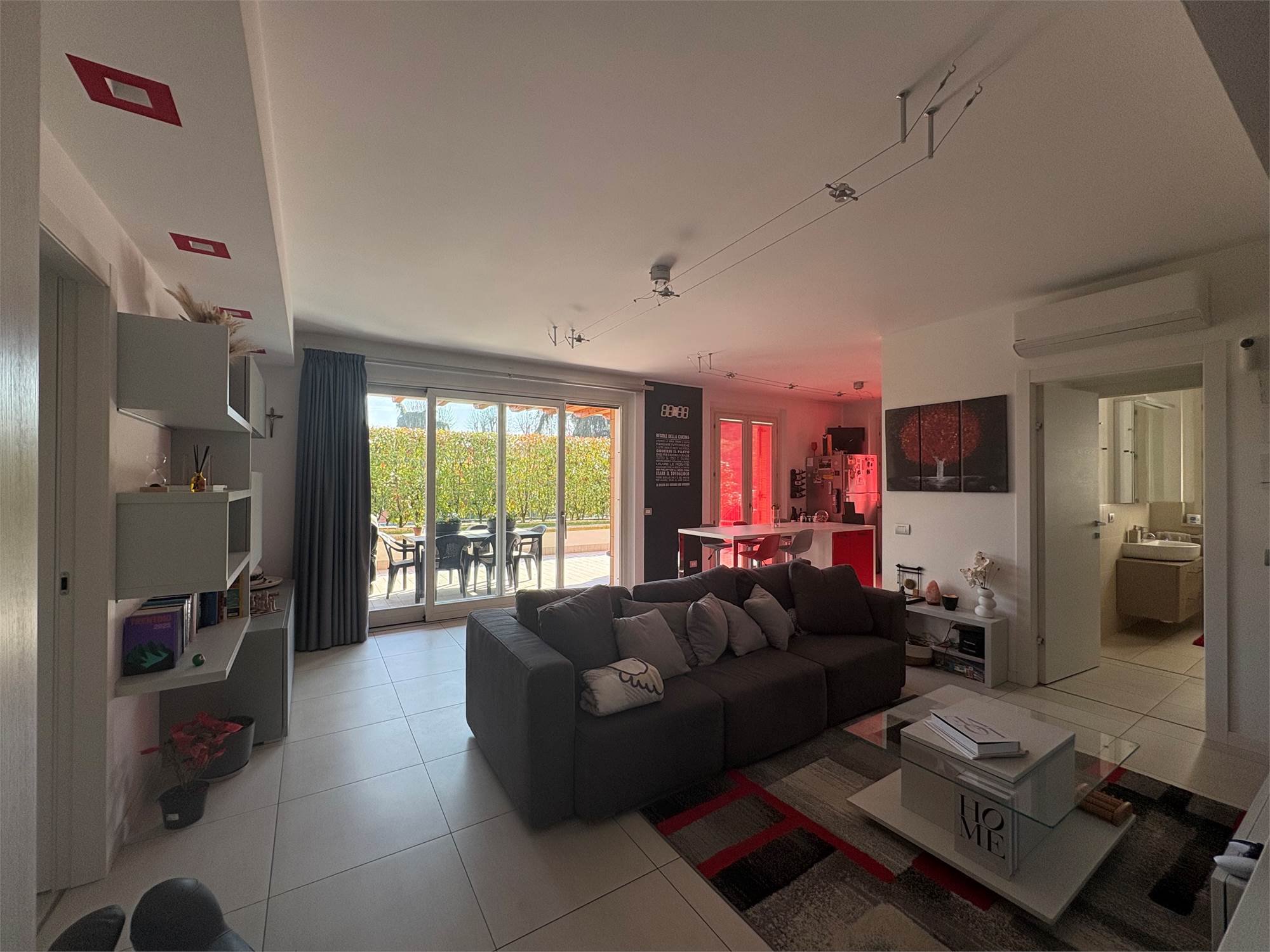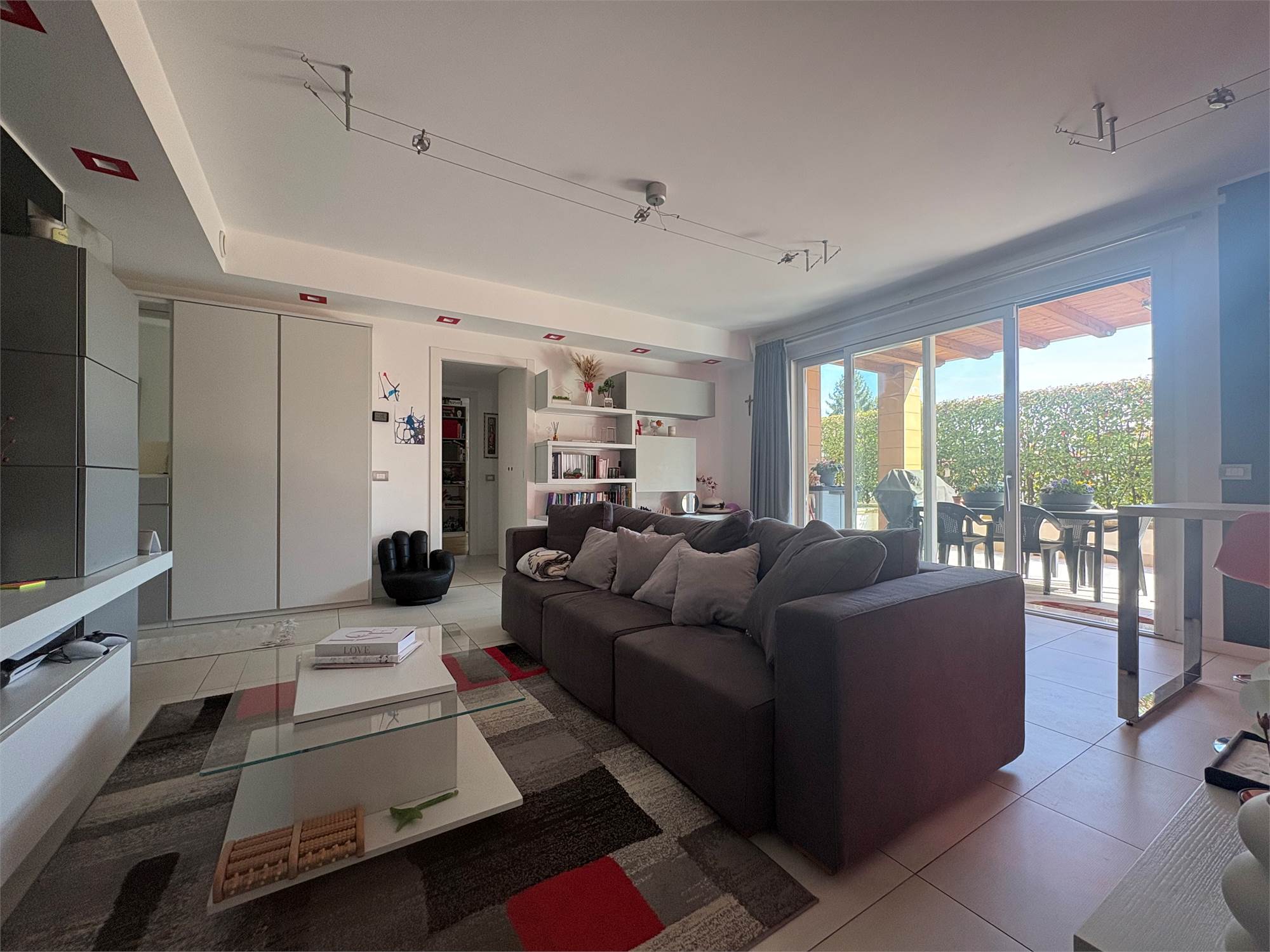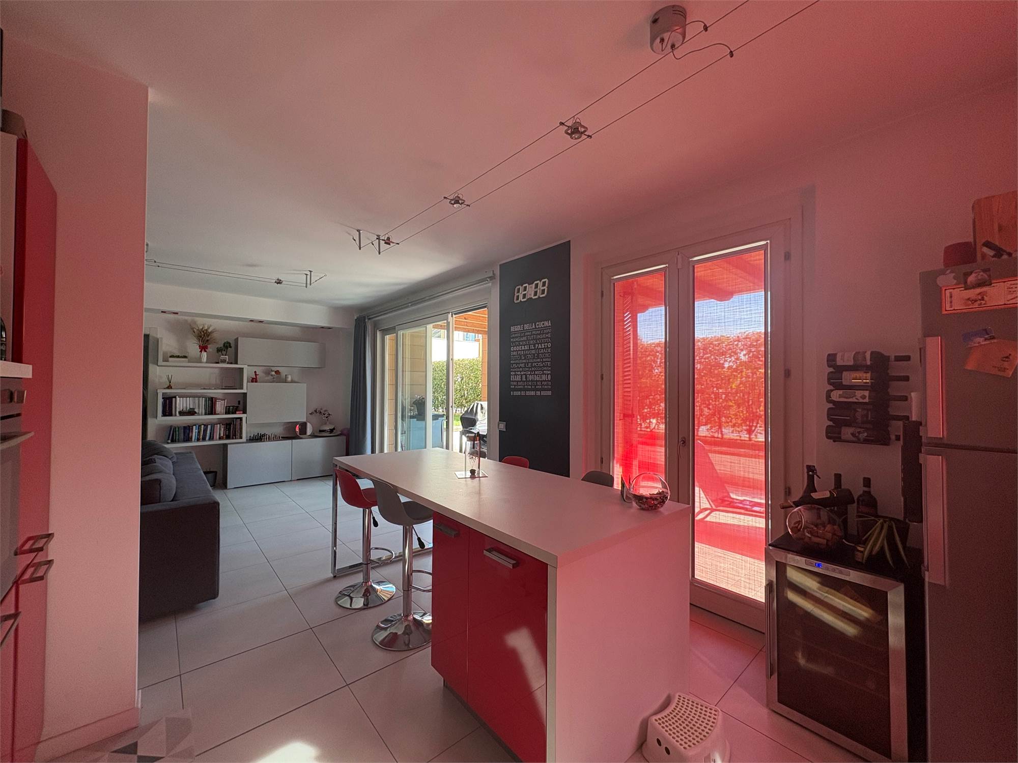 luminoso e moderno soggiorno con cucina a vista, due ampie camere da letto , doppi servizi, comodo portico coperto, ottimo per momenti di relax all'aperto e giardino privato di generose dimensioni.