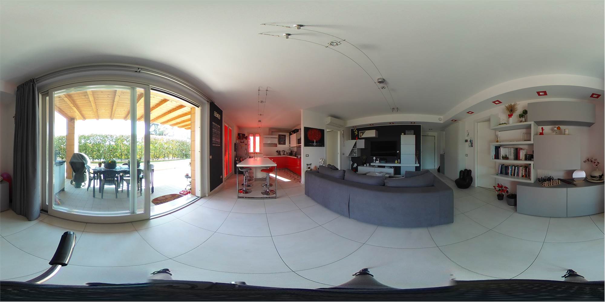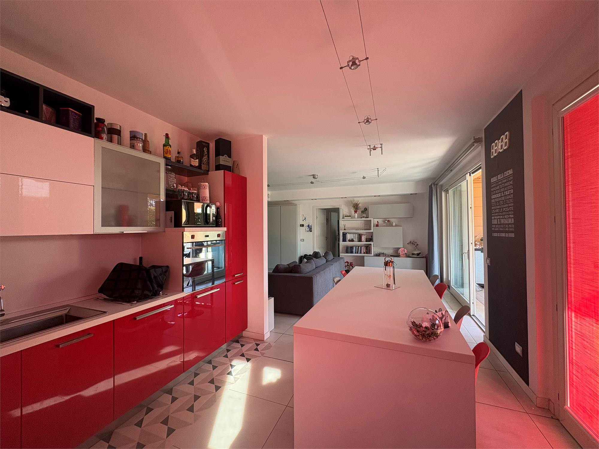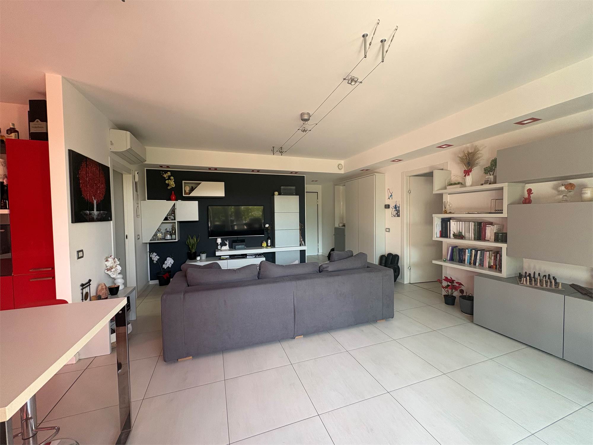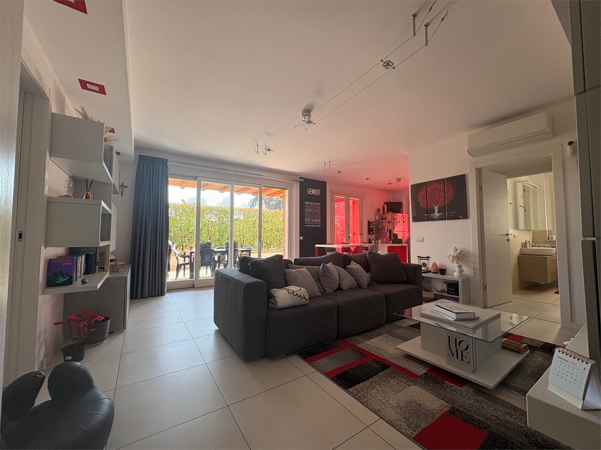 luminoso e moderno soggiorno con cucina a vista, due ampie camere da letto , doppi servizi, comodo portico coperto, ottimo per momenti di relax all'aperto e giardino privato di generose dimensioni.