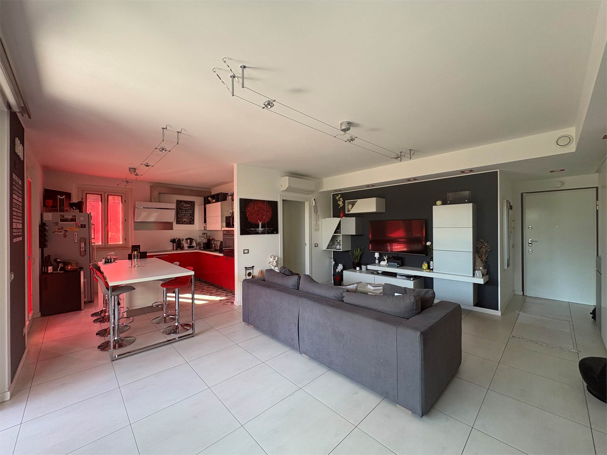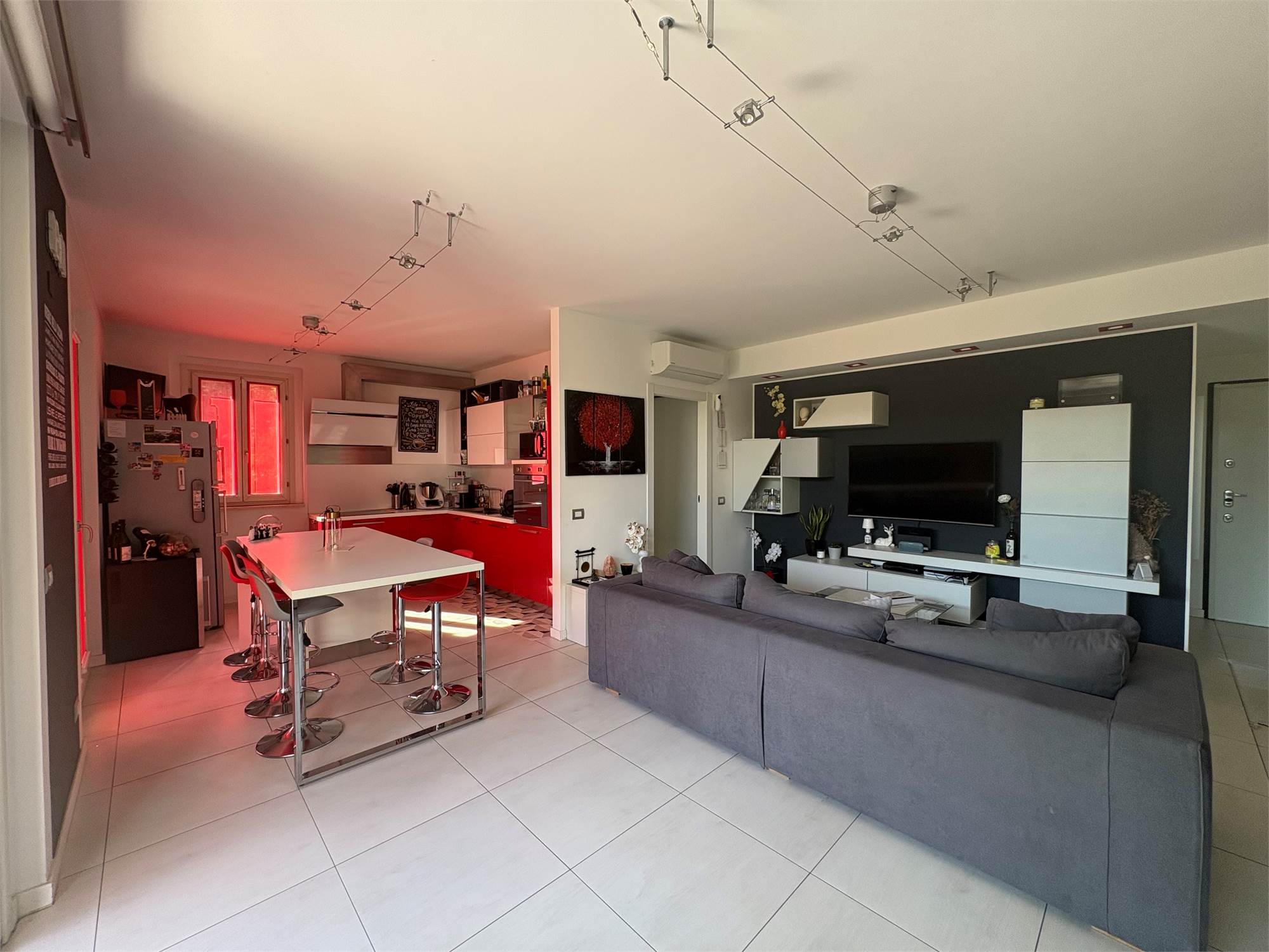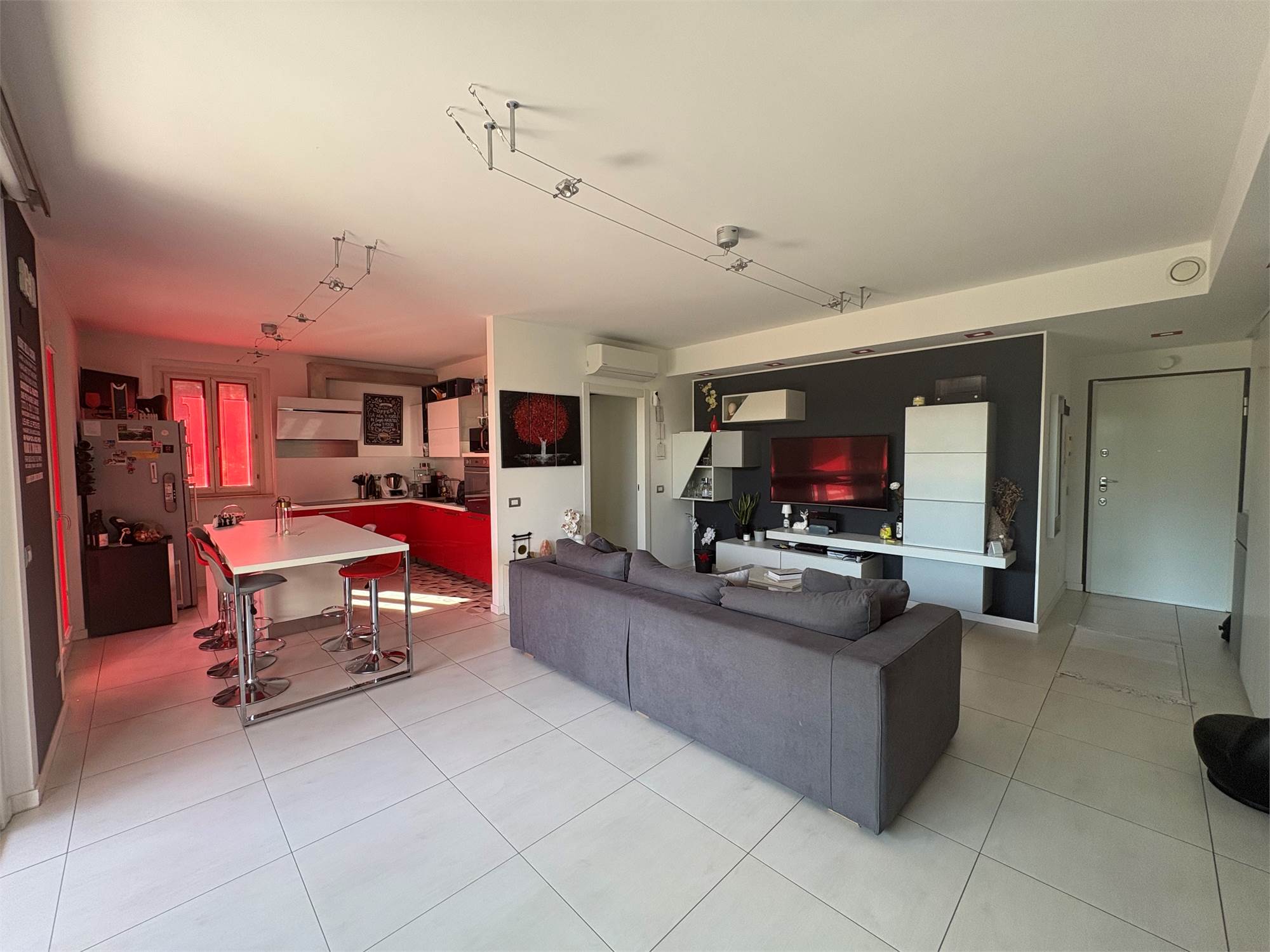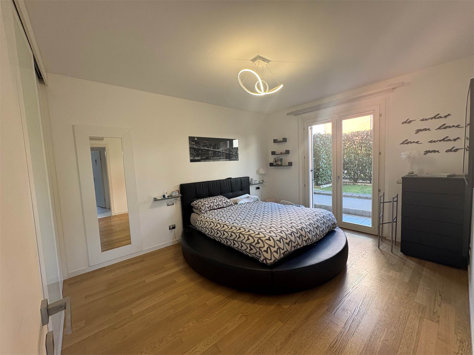 luminoso e moderno soggiorno con cucina a vista, due ampie camere da letto , doppi servizi, comodo portico coperto, ottimo per momenti di relax all'aperto e giardino privato di generose dimensioni.