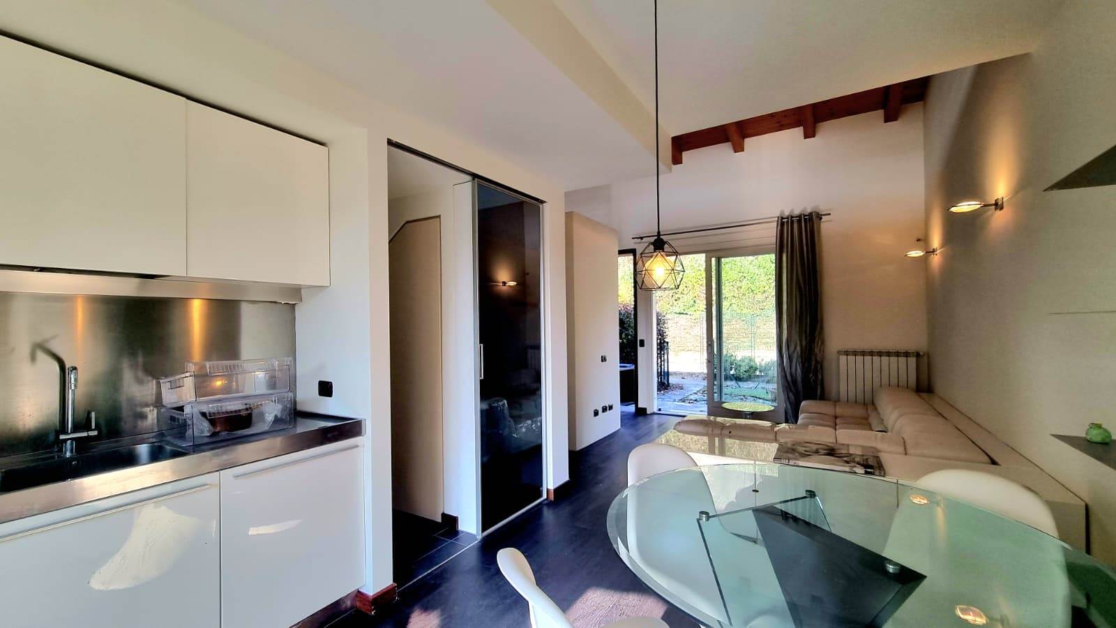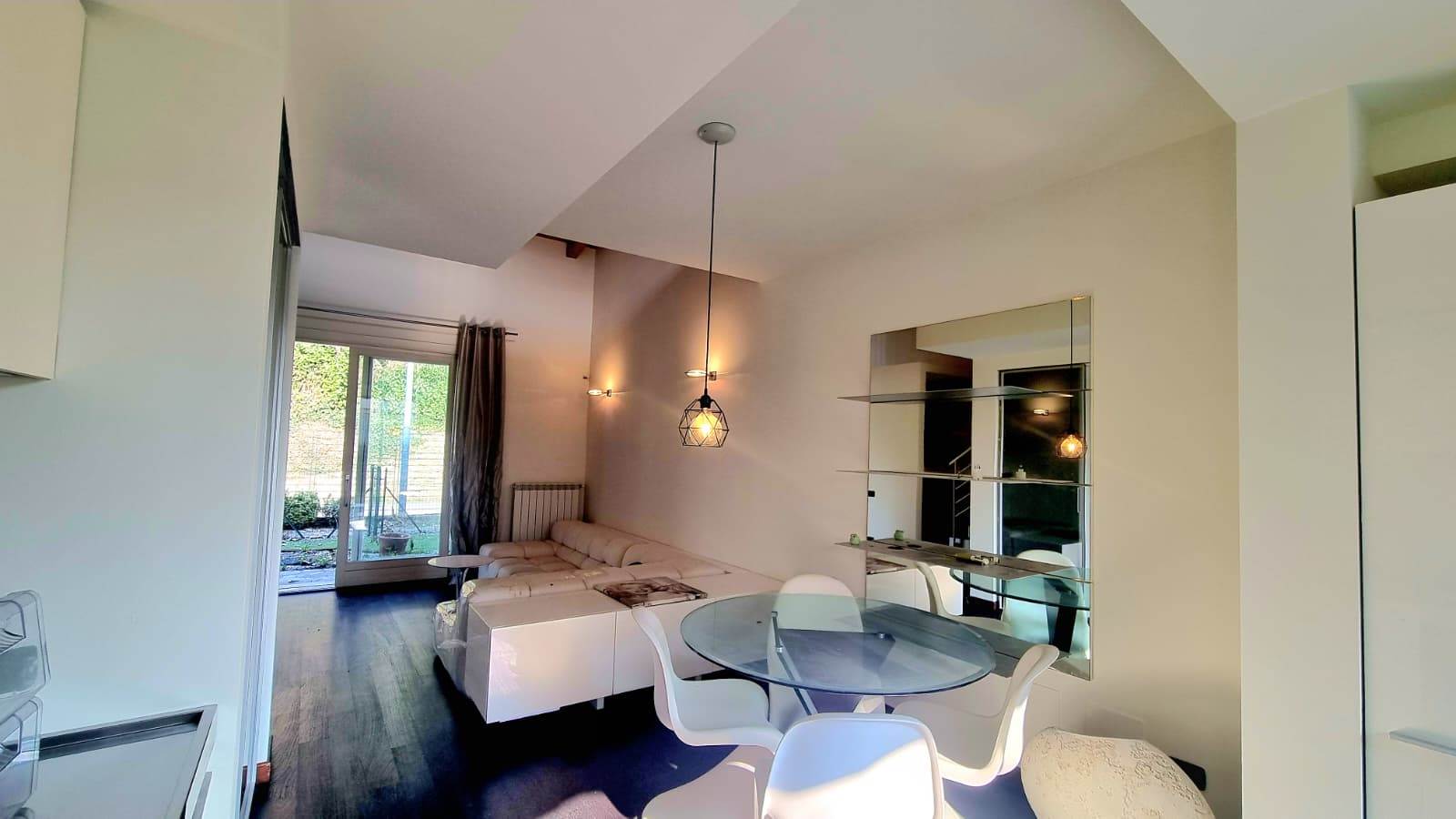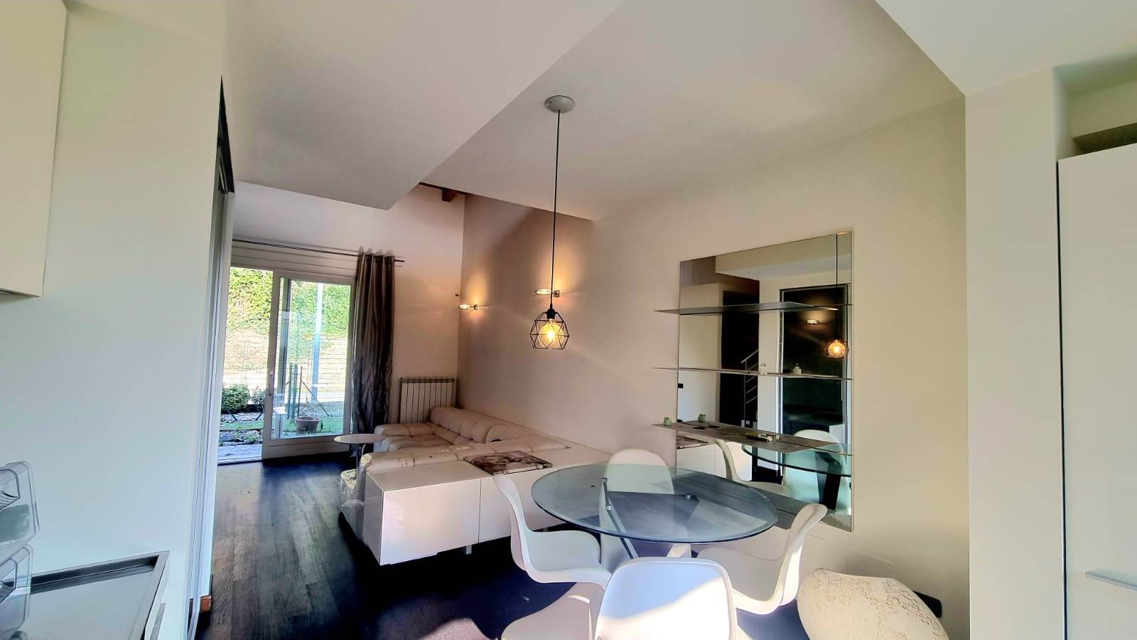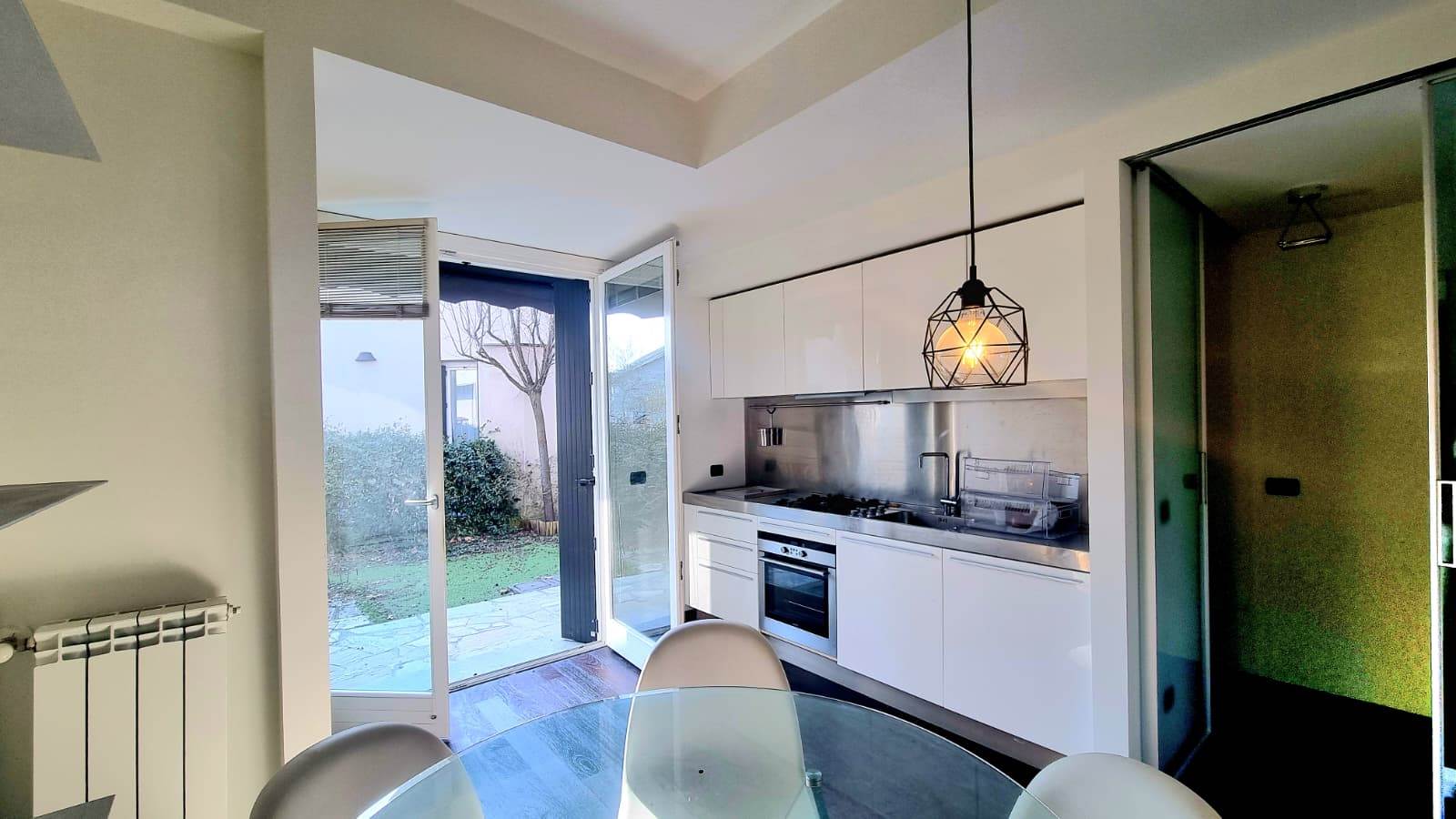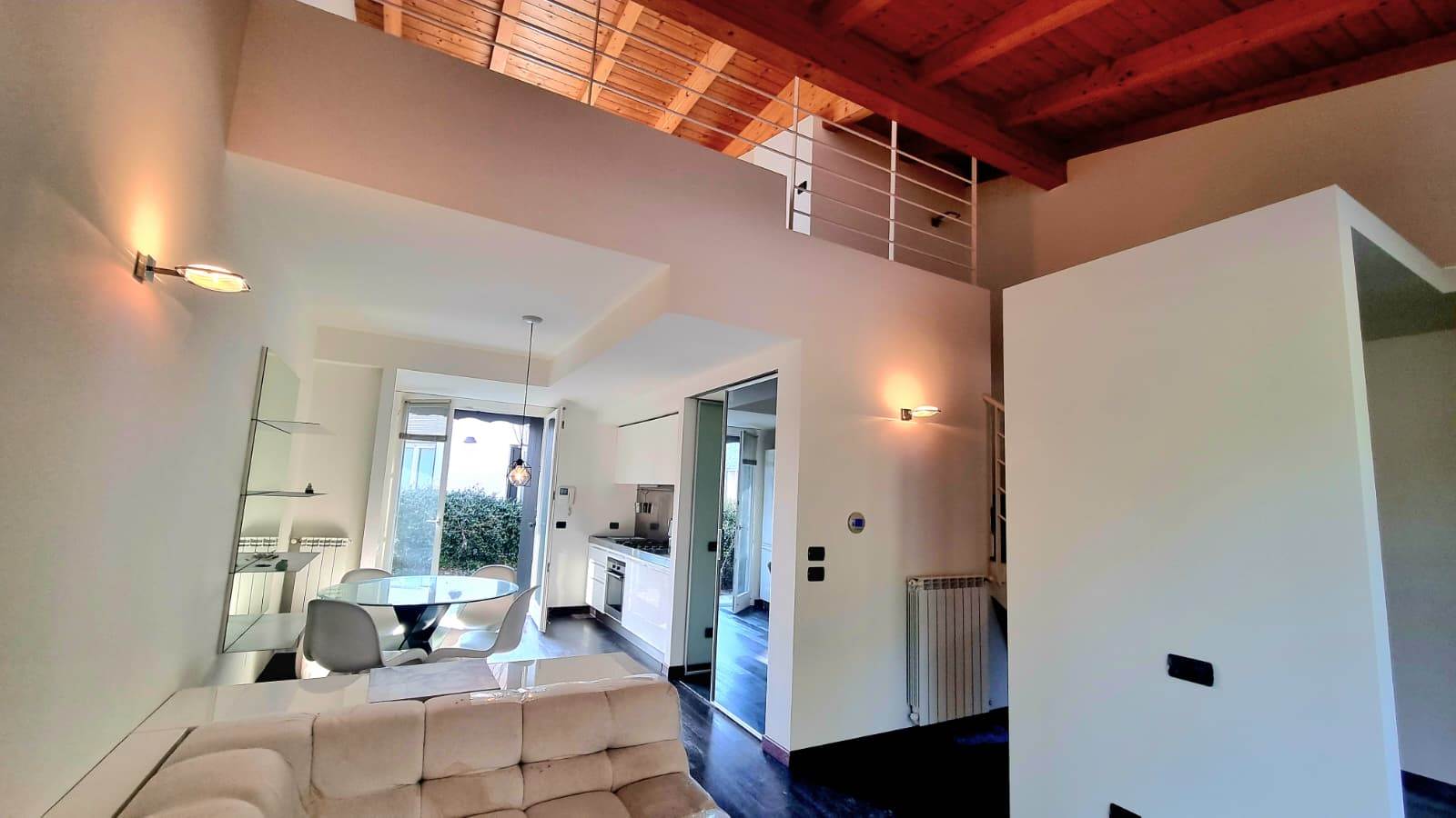 Il loft è sviluppato su due livelli e così composto: una luminosa zona living con doppio accesso sul giardino, cucina a vista ,disimpegno e bagno finestrato.