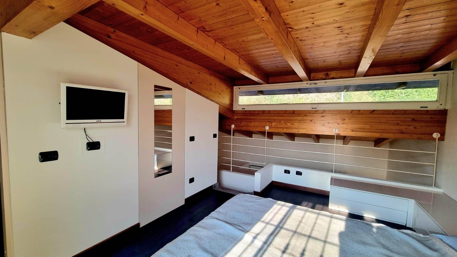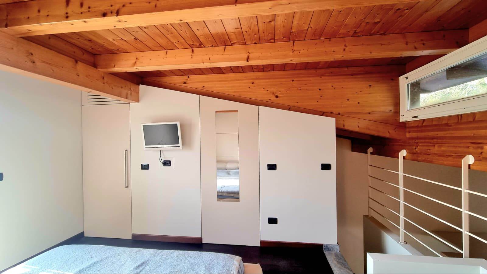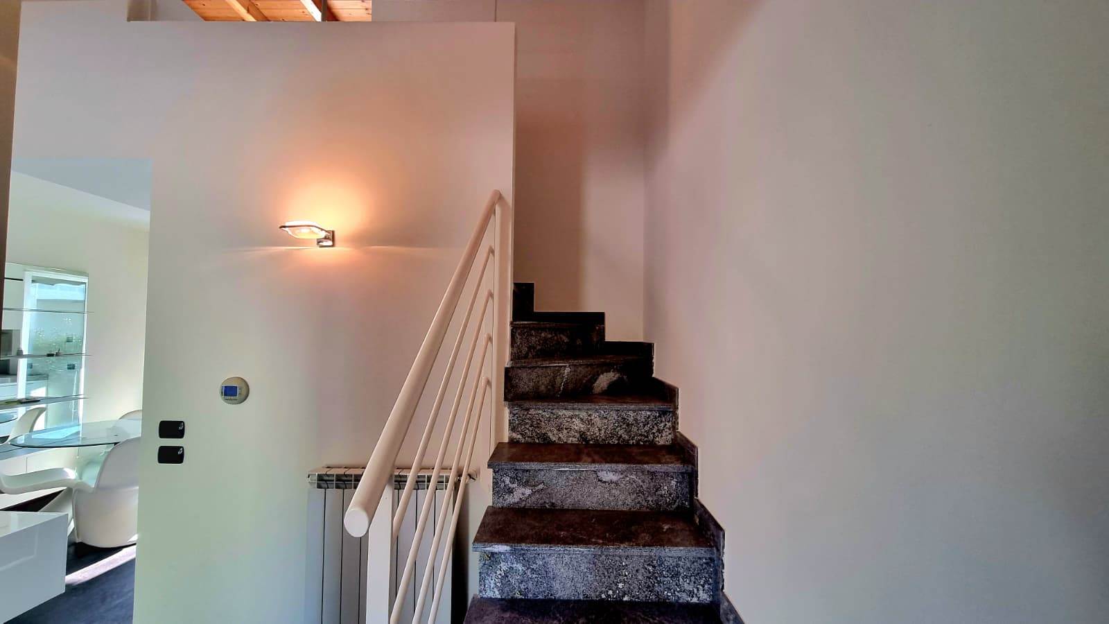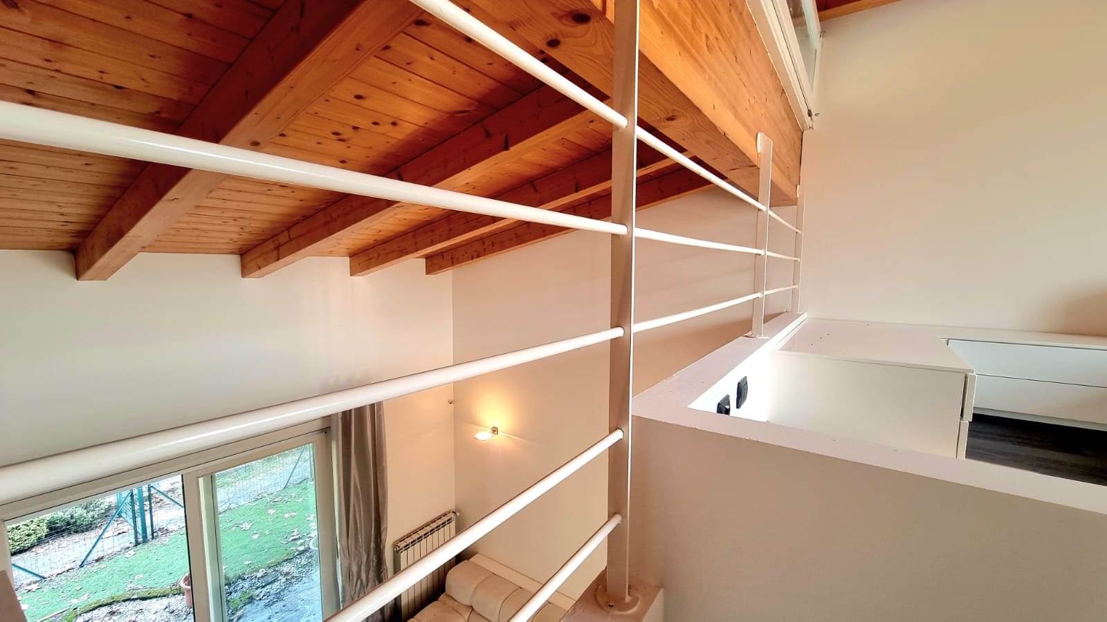 Accedendo dall'ingresso è stata realizzata una moderna struttura di disimpegno con armadiatura su misura che conduce tramite scala a vista al piano superiore dove vi è un ampio soppalco luminoso, adibito a camera, che si affaccia sul soggiorno e conduce al balcone. Il livello è completato da un'armadiatura con cabina ed un piccolo servizio. Inclusa nella proprietà' un'ampia autorimessa singola . Il presente annuncio ha valore indicativo e non costituisce elemento contrattuale